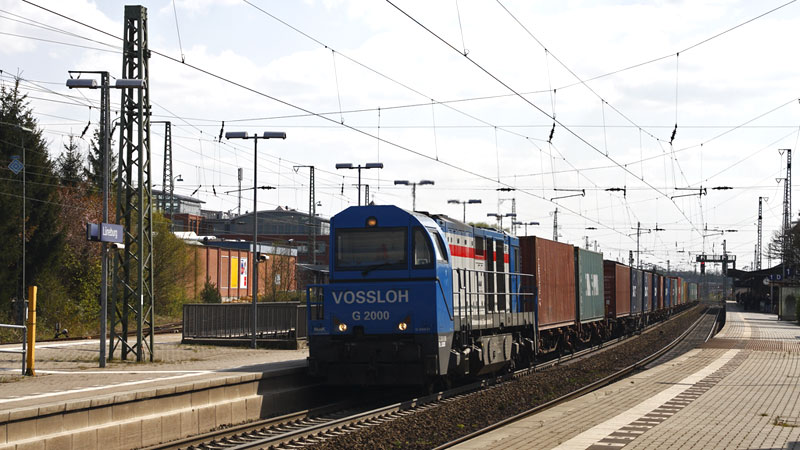 Vossloh G2000 1028 der OHE brachte Container nach Hamburg. Lüneburg, 22. April 2008 |