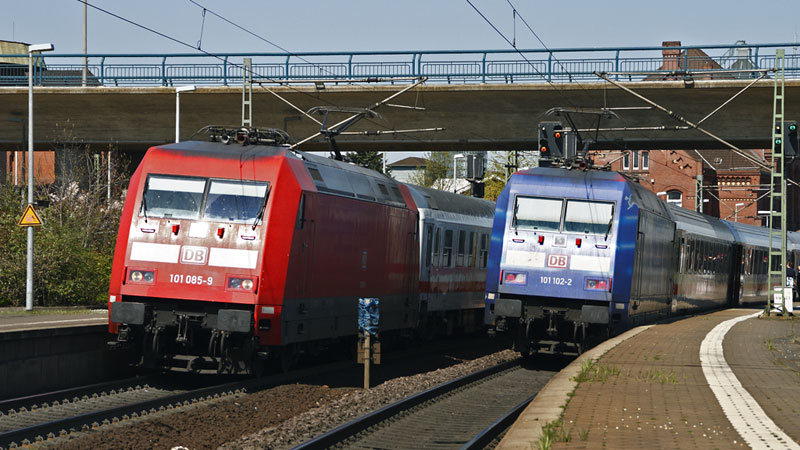 | Zwei "Bügeleisen" nebeneinander – links 101 085-9 in verkehrsrot und rechts die 101 102-2 "Azubi III" mit ihren IC's. Hamburg Harburg, 23. April 2008 | ||