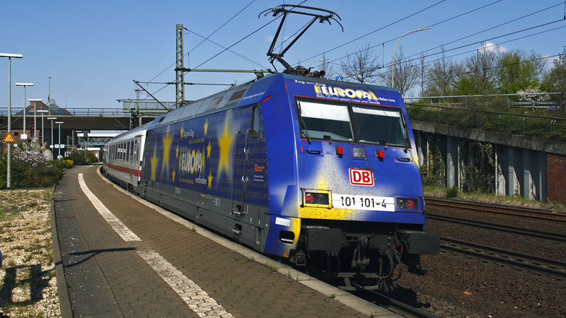 zweite Werbelok heutzutage – die 101 101-4 "Europa" mit ihrem IC nach