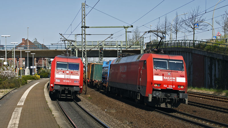 152 126-9 polterte mit ihrem Güterzug gen Süden, als die 101 032-1 mit