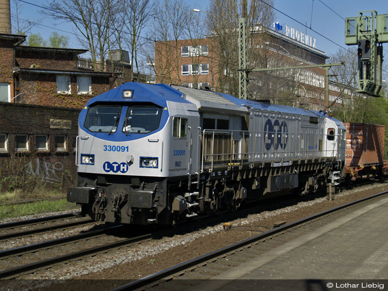Blue Tiger der LTH, 330 091 mit einem Containerzug vor dem ehemaligen