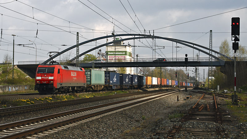 fing an zu grummeln – als erstes kam die 152 126-9 mit ihrem langen Containerzug. Tostedt, 25. April 2008 |
