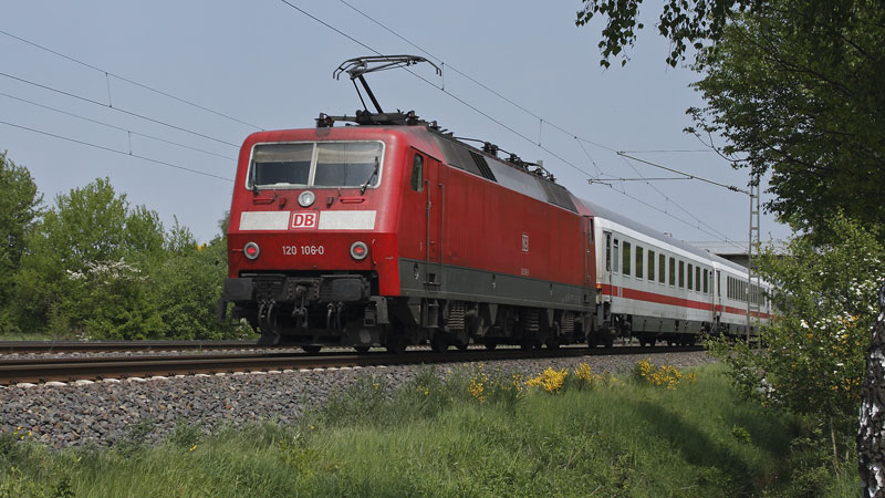 120 106-0 schob ihren IC mit Höchstgeschwindigkeit nach Hamburg. Bei Scheeßel, 14. Mai 2008 |