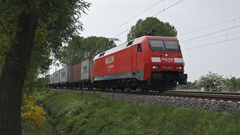 Container… in Richtung Hamburg mit der 152 101-2. Bei Scheeßel, 14. Mai 2008 |