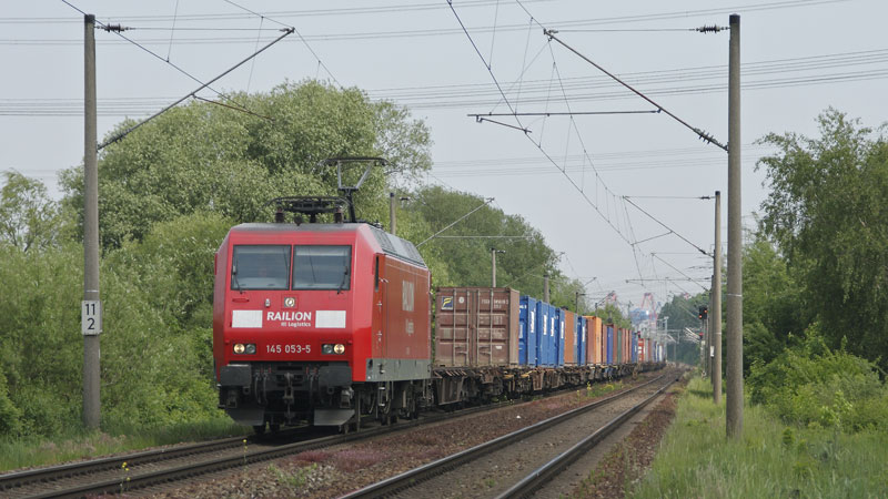 mehr Stahlkisten, diesmal mit der 145 053-5. Hamburg Moorburg, 16. Mai 2008 |