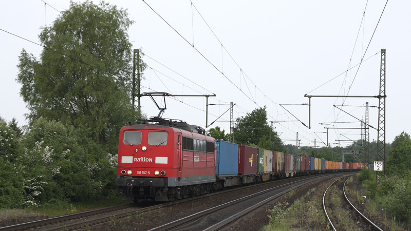 151 157-5 mit einem Containerzug aus dem Hamburger Hafen. Ashausen, 16. Mai 2008 |