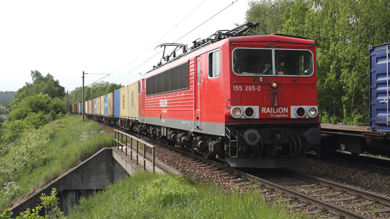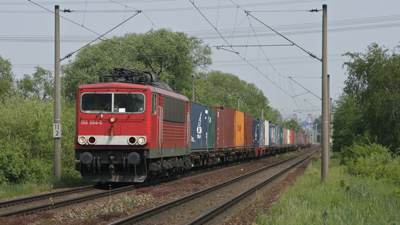 | Der Streckenabschnitt Hamburg Hausbruch – Waltershof weist mit Sicherheit eins der höchsten Containerzugdichten Europas auf. Hier die 155 265-2. Hamburg Moorburg, 16. Mai 2008 | ||