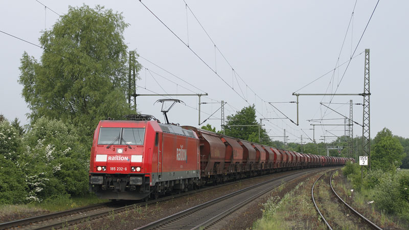 einem Kalisalzleerzug donnerte die 185 232-6 auch in den Süden. Ashausen, 16. Mai 2008 |