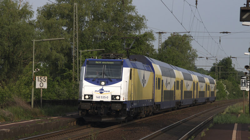 | Als die Sonne noch leicht lachte, donnerte dieser Leerzug eines ab Winsen nach Hamburg einsetzenden MEr's mit der 146 535-0 durch. Ashausen, 16. Mai 2008 | ||