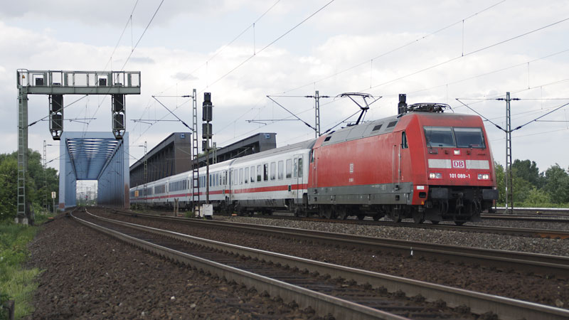 InterCity mit der 101 089-1 hatte soeben das Brückenbauwerk überquert. Hamburg Süderelbbrücken, 18. Mai 2008 |