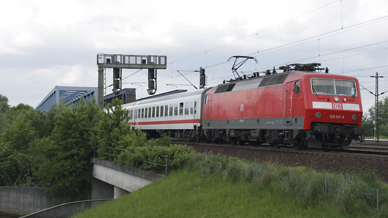 die 120 102-9 hatte einen InterCity am Haken. Hamburg Süderelbbrücken, 18. Mai 2008 |