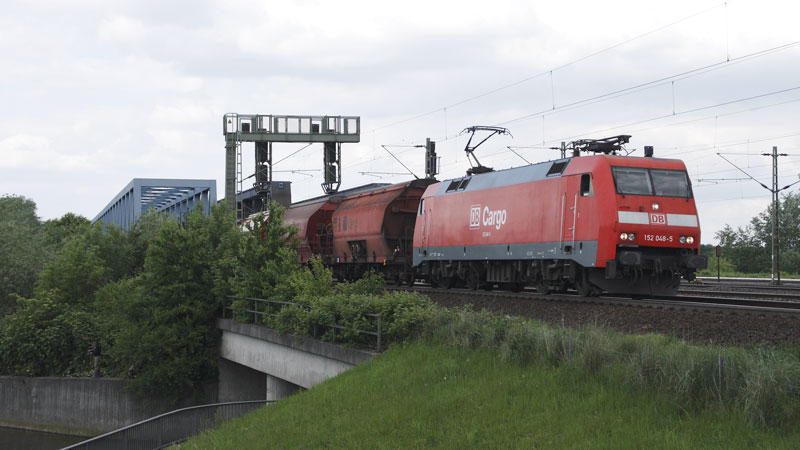 | Wenige Minuten nach Verlassen des Startbahnhofes Hohe Schaar passierte dieser Kalisalzzug mit der 152 048-5 die Vorflutbrücke. Hamburg Süderelbbrücken, 18. Mai 2008 | ||