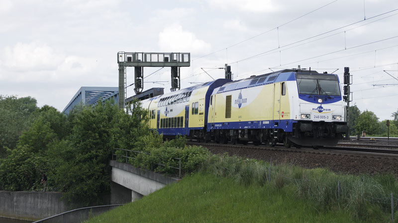 metronom nach Cuxhaven mit der 246 005-3. Hamburg Süderelbbrücken, 18. Mai 2008 |