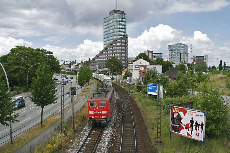 einem Containerzug aus dem Hamburger Hafen kam die 151 124-5. Hamburg Unterelbe, 16. Juni 2008 |