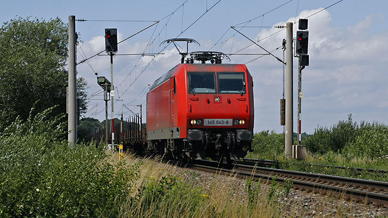 einem weiteren Stahlzug donnerte die 145 043-6 in Richtung Salzgitter/Peine. Ramhorst, 12. Juli 2008 |