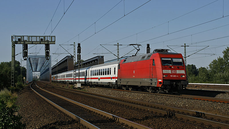 einem IC nach Kassel war die 101 083-4 zu sehen. Hamburg Süderelbbrücken, 27. Juli 2008 |