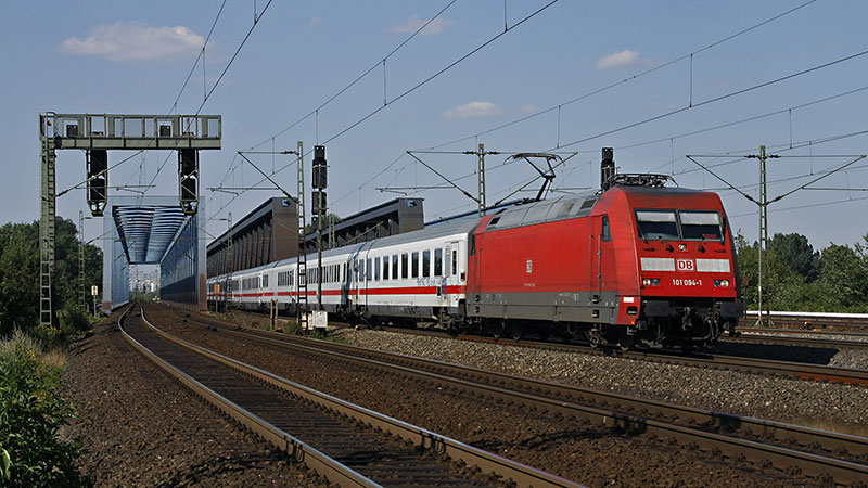 Autozug 13393 hatte die 101 052-9 am Haken. Hamburg Süderelbbrücken, 27. Juli 2008 |
