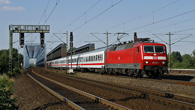 einem weiteren IC ins Rheinland donnerte die 120 134-2. Hamburg Süderelbbrücken, 27. Juli 2008 |