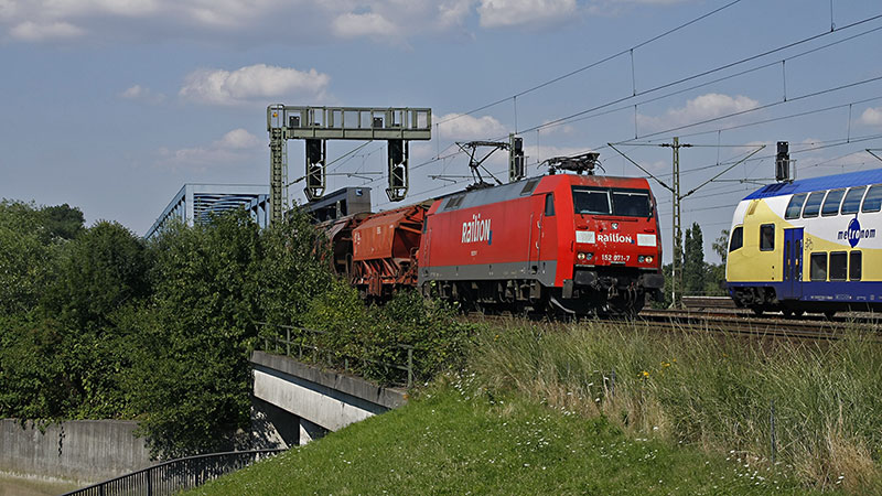 KLV-Zug von Hamburg Billwerder zog die 152 145-9 gen Süden. Hamburg Süderelbbrücken, 27. Juli 2008 |