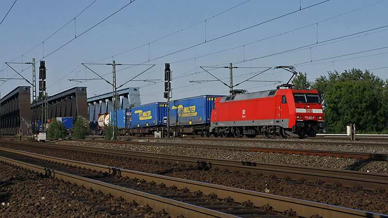 frischlackierte 155 182-9 mit einem Containerzug. Hamburg Süderelbbrücken, 27. Juli 2008 |