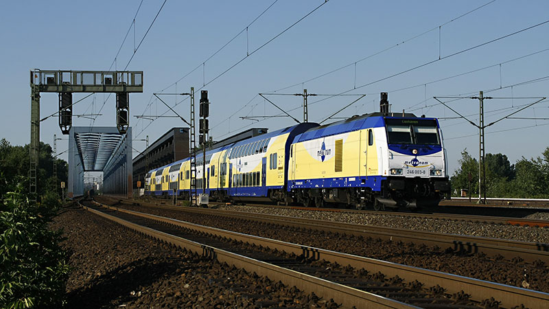Cuxhaven heulte die 246 003-8 mit ihrem Doppelstockzug. Hamburg Süderelbbrücken, 27. Juli 2008 |