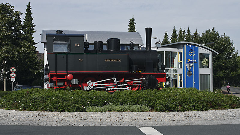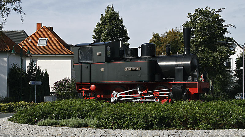 | Auf einem Verkehrskreisel vor dem Bahnhof steht die Denkmallok "Bruchhausen" – im Hintergrund die Hauptverwaltung der Mittelweserbahn! Bruchhausen-Vilsen, 2. August 2008 | ||
