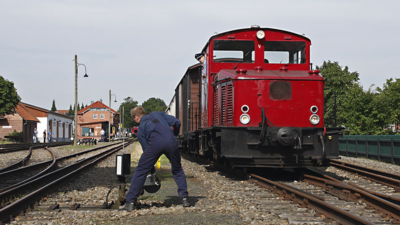 verlorengangenes Nebenbahnflair – die Handweiche wird umgestellt. Bruchhausen-Vilsen, 2. August 2008 |