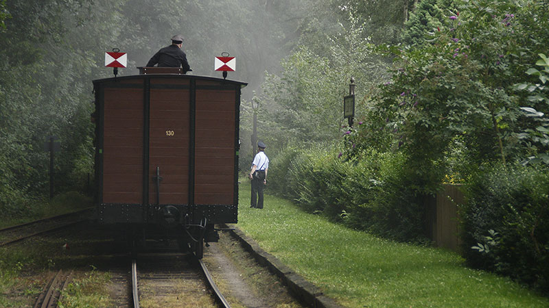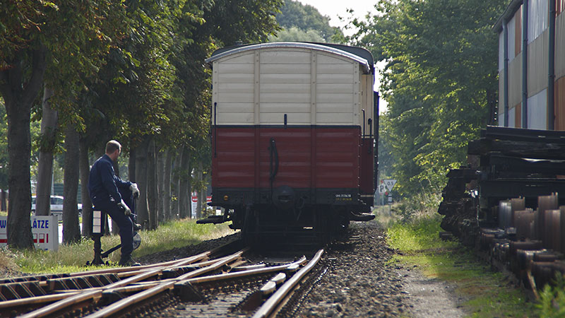 Kleinbahnflair mit Bremser auf dem Güterwaggon und Schnaffer auf