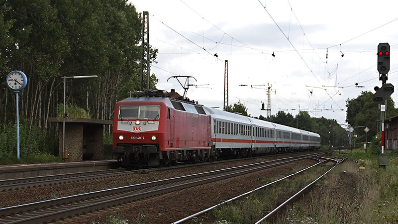 120 148-2 in orientrot und mit Latz rannte mit ihrem IC nach Hamburg. Radbruch, 29. August 2008 |
