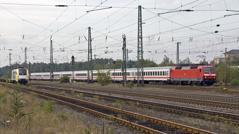 | Während die 120 137-5 mit ihrem IC durch die weitläufigen Bahnanlagen durch kachelte, rollte ES 64 U2-016 langsam mit ihrem boxxer auf dem Ausweichgleis gen Maschen durch. Buchholz (Nordheide), 26. September 2008 | ||