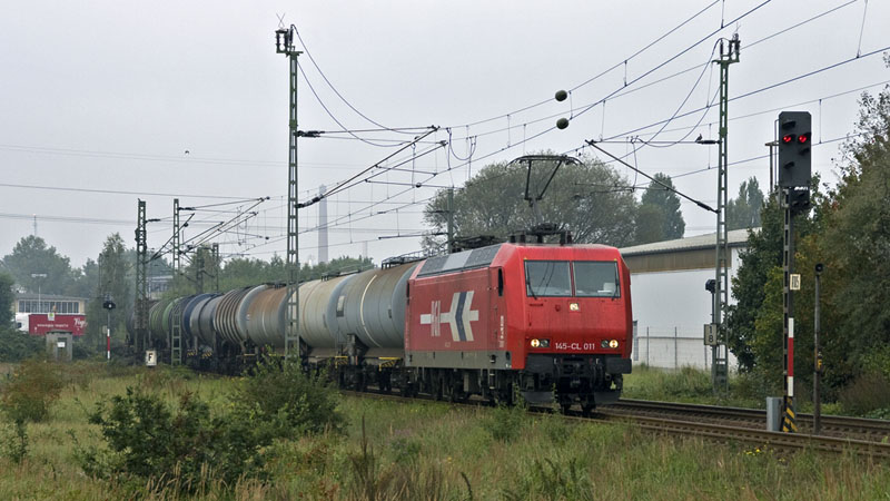 einem Kesselwagenzug fuhr die 145-CL 011 der HGK aus dem Chemiebahnhof