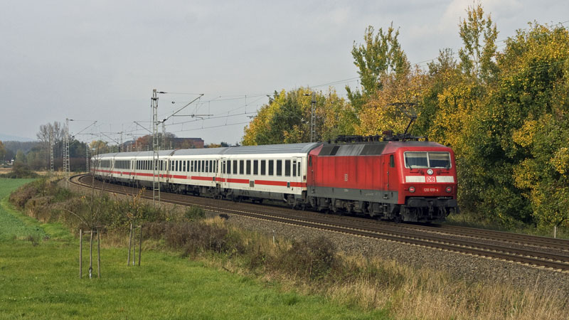 120 109-4 schob ihren InterCity in den Norden. Limmer (Leine), 18. Oktober 2008 |