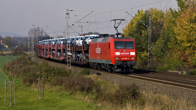 | Die PKW-Industrie ist ein großer Bahnkunde… hier schleppte die R4C 185 533-7 für die TXL diesen ARS-Altmann Autozug südwärts. Godenau, 18. Oktober 2008 | ||