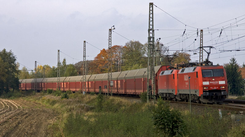 Schwerathlet 152 083-2 zog diesen ellenlangen Containerzug nordwärts. Burgstemmen, 18. Oktober 2008 |