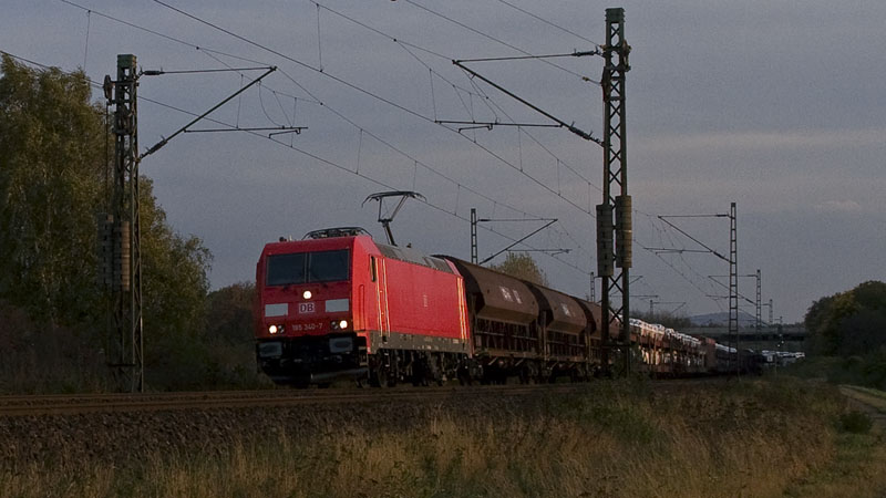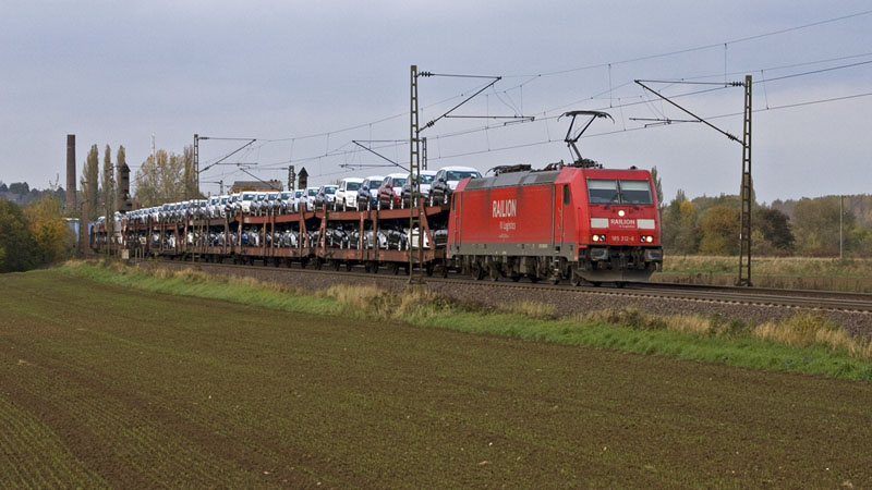 neue PKW's… die 185 312-6 mit einem Autozug. Elze (Han), 18. Oktober 2008 |