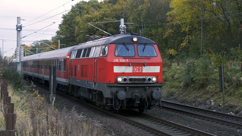 besten Licht dieselte die 218 326-7 mit ihrer RegionalBahn nach Ahrensburg. Hamburg-Rahlstedt – BÜ Dassauweg, 31. Oktober 2008 |