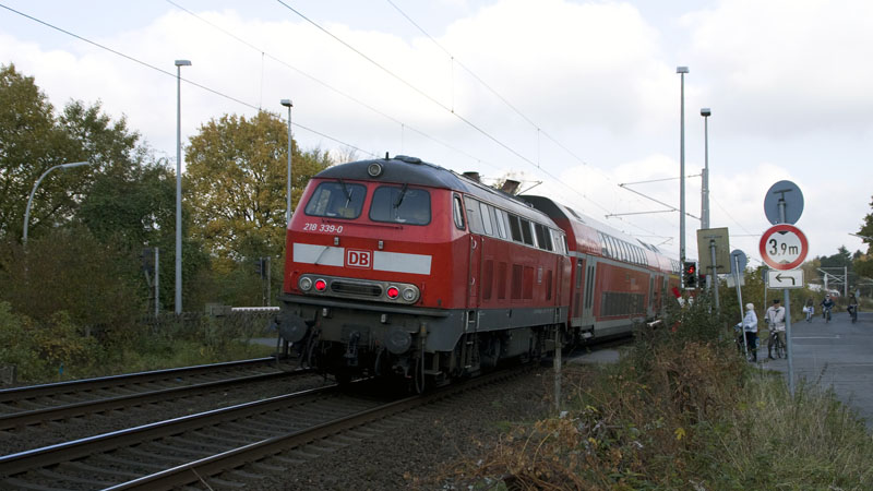 ein doppelstöckiger RE nach Hamburg – vorne zog die 218 339-0. Bei Ahrensburg-West, 31. Oktober 2008 |