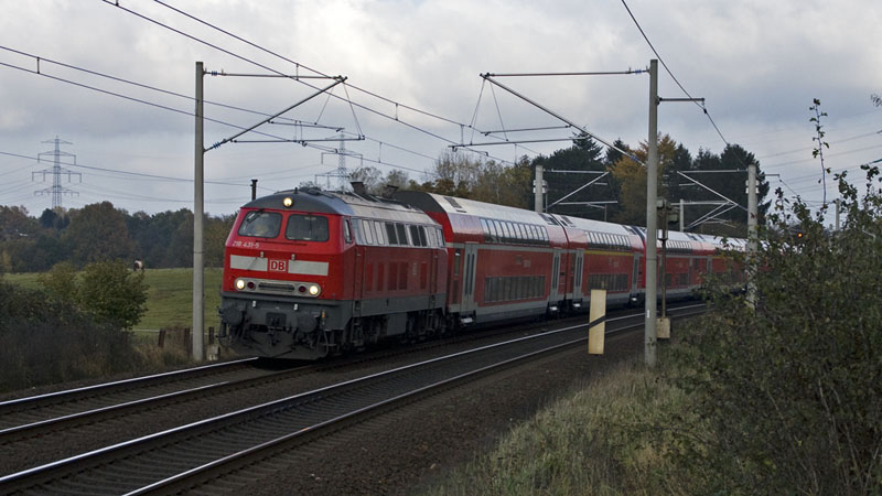donnerte dieser RegionalExpress mit der 218 435-6 voran … Kupfermühle, 31. Oktober 2008 |