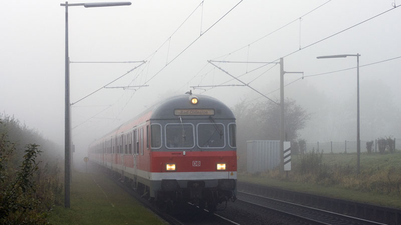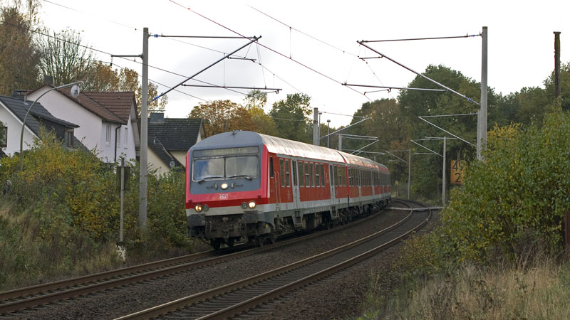 RegionalBahn nach Bad Oldesloe mit dem Wittemberger Steuerwagen voraus. Hamburg-Rahlstedt – BÜ Dassauweg, 31. Oktober 2008 |