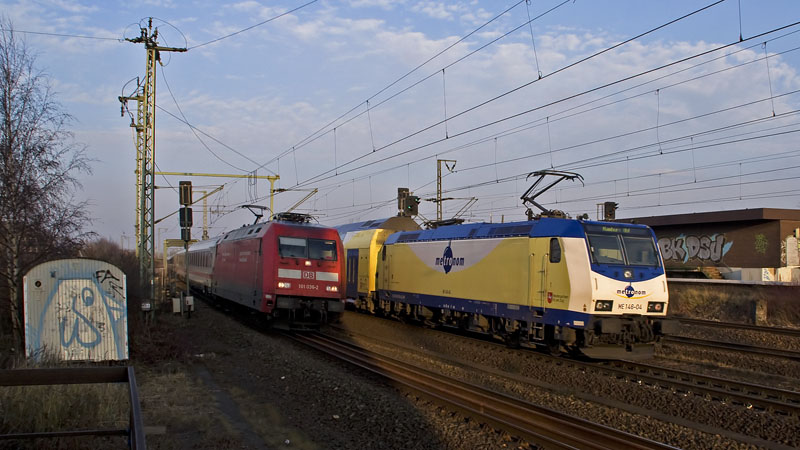 schiebende ME 146-04 passierte diesen InterCity mit der 101 036-2. Hamburg-Veddel, 14. Dezember 2008 |