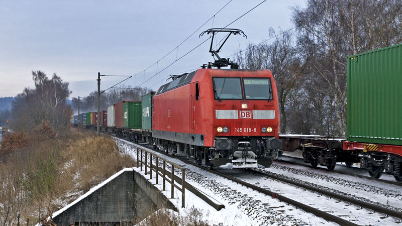 | Gleichzeitig kam ein weiterer Containerzug herein, ebenso mit einer 145 – die 145 018-8. Hamburg-Moorburg, 6. Januar 2010 |