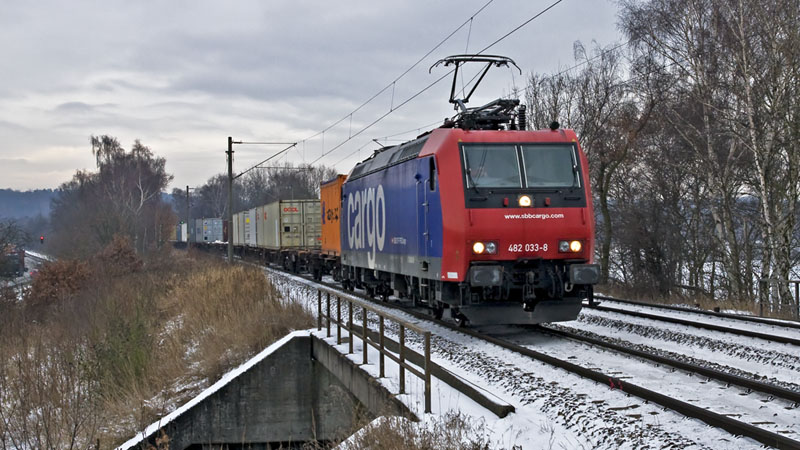 | Noch eine SBB Cargo-Lok, die 482 033-8 mit einem weiteren Containerzug. Hamburg-Moorburg, 6. Januar 2010 |