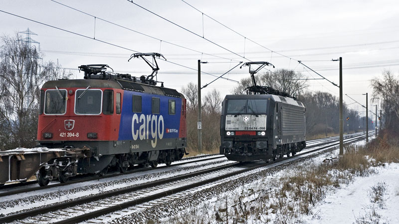| Die schöne Schweizerin 421 394-8 der SBB Cargo kam mit weiteren Containern. Hamburg-Moorburg, 6. Januar 2010 |