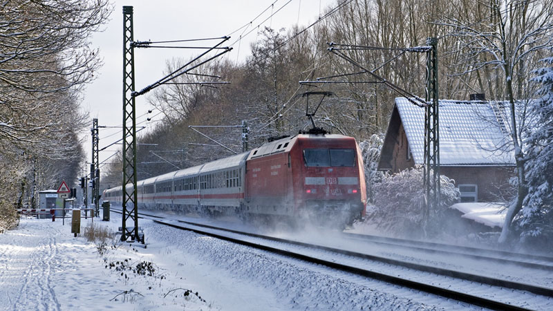 | Der InterCity 2310 mit der herantosenden 101 064-4. Prisdorf | Peiner Hag, 30. Januar 2010 |