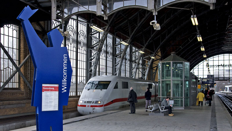 | Ein Willkommensgruß für den einfahrenden ICE 797 mit dem Triebzug 157. Hamburg Dammtor, 19. Februar 2010 |