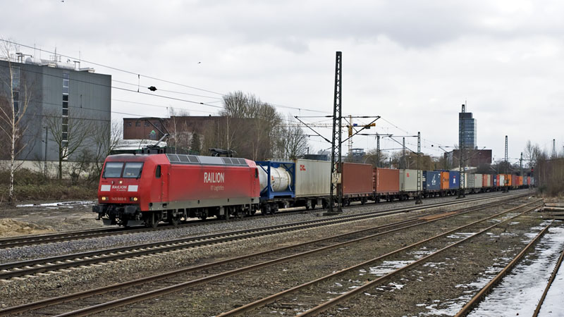 | Die Baureihe 145 verdingt sich komplett im Containerverkehr – so auch die 145 050-1. Hamburg-Moorburg, 27. Februar 2010 |
