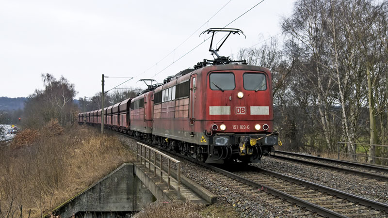 | Dagegen kamen in wenigen Minuten später die 151 109-6 und 151 099-9 mit einem weiteren Erzleerpark. Hamburg-Moorburg, 27. Februar 2010 |