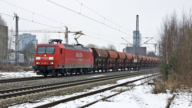 | Einen hier ungewöhnlichen Schotterzug hatte die 145 001-4 am Haken. Hamburg-Unterelbe, 11. März 2010 |