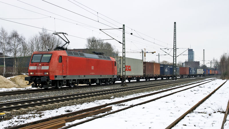 | Nach Waltershof fuhr die verblichene 145 018-8 mit ihrem Containerzug. Hamburg-Unterelbe, 11. März 2010 |