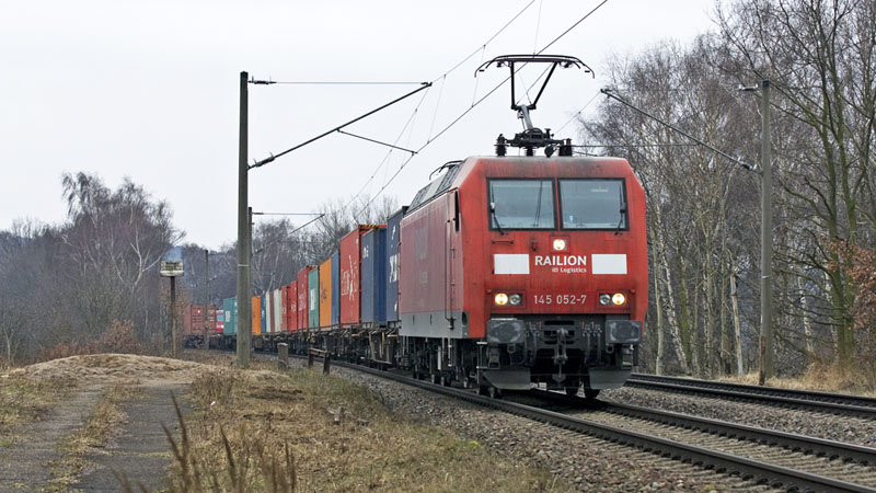 | Langsam rollte dieser Containerzug mit der 145 052-7 herein. Hamburg-Moorburg, 12. März 2010 |